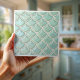 This coastal ceramic tile design features a pattern of stylized fish scales in shiny light mint green tones outlined in ivory white. The flowing, hand-drawn lines create a sense of movement, while the watery textures add depth and a calm, ocean-inspired atmosphere. Perfect for beach-inspired décor themes, it brings a touch of underwater serenity to any room. Note: design may contain generative content