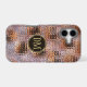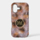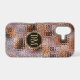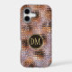 This elegant phone case features your two letter monogram in pale gold at the centre of a black circle banner that is double framed in gold. The banner is placed on a gradient background pattern that looks like glass segments fitted together. Colours used include lavender, violet, gold, and black.