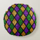 Shiny green, purple and golden glittering paillettes diamonds background pattern fabric with empty space for copy, room for text. Mardi Gras holiday poster backdrop.