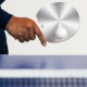 Shiny silver-grey metallic texture, stainless steel texture with black monogram.
