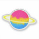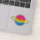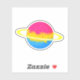 Digital art of a shiny planet in the colours of the pansexual flag surrounded by rings like Saturn in outer space.