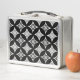 Lunch box in a traditional Japanese Shippo, or "seven treasures" pattern of interlocking circles with a central flower motif - flowers in shades of grey / grey with a black and white patterned background