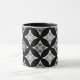 Traditional Japanese Shippo, or "seven treasures" patterned mug of interlocking circles with a central flower motif - flowers in shades of grey / grey with a black and white patterned background