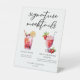 This chic signature mocktails menu pedestal sign features custom black typography above 2 non-alcoholic drinks and their ingredients for your wedding bar. A cute Shirley Temple and Virgin Strawberry Daiquiri drawing add a cool flair to your bar menu. Complete with the couple's names and date for their reception.