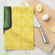 A green shishito chilli pepper, also known as kkwari-gochu in Korean, is decorated with patterns inspired by Korean designs and sits on a yellow background with a smaller version of the same pattern and a script label in the corner. This mild pepper is eaten throughout Korea and Japan both raw and cooked.