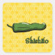A green shishito chilli pepper, also known as kkwari-gochu in Korean, is decorated with patterns inspired by Korean designs and sits on a yellow background with a smaller version of the same pattern and a script label in the corner. This mild pepper is eaten throughout Korea and Japan both raw and cooked.