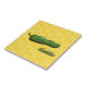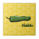 A green shishito chilli pepper, also known as kkwari-gochu in Korean, is decorated with patterns inspired by Korean designs and sits on a yellow background with a smaller version of the same pattern and a script label in the corner. This mild pepper is eaten throughout Korea and Japan both raw and cooked.