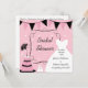 Pretty and cute customised Shoe For Thought bridal shower invitation features a wedding cake with a unique shoe topper, wedding dress, and banners on a pink polka dot background and areas you can add the guest of honour's name, and specifics of the bridal shower including date, time, location, RSVP information, and more.