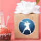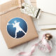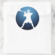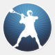 Locked, cocked and ready to rock. Silhouette of lacrosse player in the midst of firing a shot on goal. Circular emblem design in blues with emanating rays.