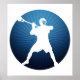 Lacrosse Shooter. Locked, cocked and ready to rock. Silhouette of lacrosse player holding stick, in the midst of firing a shot on goal. Circular emblem design in blues with emanating rays. Lacrosse poster print .