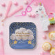 A magical atmosphere with golden glitter stars, a shooting star, and a cloud. There are two special stars above the cloud representing the two children that will be born soon. It also has the wording "He counts the stars and calls them all by name. (Psalm 147:4)". Click to customise further to resize or change the position of the elements in this design (which are: the falling stars, the shooting star, the two golden glitter stars, the magical cloud, and, finally, the wording).