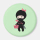 Cute cartoon ninja girl dressed in black but for a pink bow on top of her head mask. Traditional Japanese katana sword can be seen strapped to her back, it’s handle also coloured pink. The girl is holding a pink shopping basket.