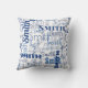 This unique pillow features shades of blue with your own family name in a modern and trendy typography pattern of different fonts. Great gift for the new home owner or if you are looking for blue and white home decor. Available for both short or long last names.