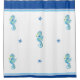 Shower curtain shown in a mix of seashore colours of Royal Blue, White, Cornflower Blue and Sky Blue. Fun seahorses of Blue/Green-Multi print all over with Royal Blue wide solid border at top with a Sky Blue and White stripe; and at bottom, a Royal Blue slightly thinner border with same combination colour of stripes. Customise this item or buy as is.