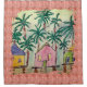 Presented as a paint-stroke image is this tropical cabin with tall palm trees reaching towards the sky, a mixed media work of art.