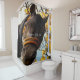 shower curtain with a black quarter horse with a orange harness on looking at you though the kitchen window. The window ledge below him and the grayish wall as well. You can see the yellow fall leaves on the maple tree outside the window.