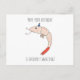 This postcard is printed with a hand-drawn design featuring a cute, orange shrimp in a birthday hat and the play-on-words message "Hope your birthday is shrimply amazing". The inside is left intentionally blank to allow for a personalised message.