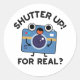 Shutter Up For Real Funny Camera Photography Pun features a cute camera looking surprised. Perfect pun gift for family and friends who love cute camera puns.