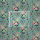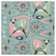 My original vector illustration of mid century style abstract cats, cubes, starbursts, boomerang, lozenges, & more, in pink, green, mocha, light tan, & black on blue.