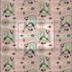 Mid century style abstract Siamese cats, cubes, starbursts, boomerang, lozenges, & more, in mocha, green, light tan, black and a hint of blue on textured pink.