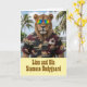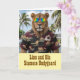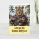 A lion wearing a Hawaiian shirt and sunglasses has a Siamese cat kitten in his pocket.