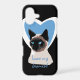 Any Siamese cat owner would love this iPhone case! It features a beautiful art image of a blue eyed siamese cat, with a matching blue and white heart image behind it, and all placed on a black background that really makes the cat image stand out. Change the text to anything you'd like; personalise it with your name if you'd prefer.