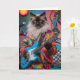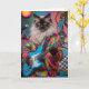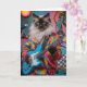 A Siamese cat in psychedelic garb is playing electric guitar.