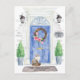 Announce your new address with our stylish announcement featuring a Siberian cat, blue front door, welcome mat, slate sign, topiaries and a floral wreath set on a grey brick background.