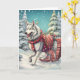 This charming hand-drawn illustration showcases a Siberian Husky pulling a sleigh filled with gifts and Christmas decorations, all while wearing playful reindeer antlers. The pastel colours and rough sketchy style add to the festive, magical holiday atmosphere, complete with twinkling stars and snowy mountain scenery in the background.