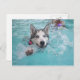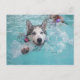 Photograph of a Siberian Husky swimming in a swimming pool.