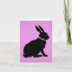 This notecard has the side profile of a sitting black rabbit done in silhouette wearing colourful flowers around it's neck and having a pink eye on a pink background.