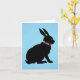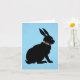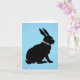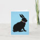 This notecard has the side profile of a sitting black rabbit done in silhouette wearing colourful flowers around it's neck and having a pink eye on a light blue background.