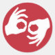 Sign language sticker with a hand symbol that indicates that sign languageinterpretation can be provided. Change the background colour to any colour you like. This can be used at businesses or events to let people know who can interpret.