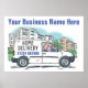 Promote your home delivery service. Poster has illustration of a white van with Home Delivery on the side, as well as your contact number. The name of your business is at the top. White van man delivering to your home.