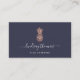 Chic modern design features a faux rose gold foil pineapple illustration, the traditional symbol of hospitality, on a rich midnight blue background. Add two lines of custom text to the front, with your name or business name in chic handwritten script, and customise the back with your full contact details beneath a smaller pineapple illustration. Perfect for hospitality industry professionals, chefs, caterers or any occupation.