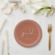 Signature script "grad", graduation party paper plates. White typography on rust orange background with delicate deco pattern border.