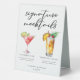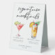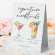 This chic signature mocktails table tent sign features simple black tyopgraphy above 2 cute drinks and their ingredients for your wedding bar. A Cranberry Cutie or non-alcoholic Cosmopolitan and a virgin Piña Colada add a cool flair to your bar menu. Complete with the couple's names and date for their reception.