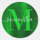 Bright green and white contemporary monogram with elegant signature style calligraphy design set on a classic round sticker.