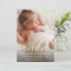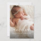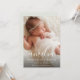This elegant photo birth announcement features a large photo and lovely calligraphy on the front. Your newborn's first name is written in modern script, and additional details can be added below. The text overlays a full-bleed vertical photo. The neutral light grey background colour on the back of the card can be changed if desired.