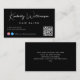Chic black business card featuring your name or brand showcased in a stylish white signature script and business type in simple modern white lettering. Input your website address to create a QR code for customers and clients to scan for a list of your products, services, hours, etc., and add your instagram and facebook user ids for customers to follow you on social media. You can add additional information on the back or leave blank.