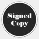 Signed copy Book signing stickers with the text "signed copy" surrounded by a white border on a black background. Bold, minimalist and modern font and design.