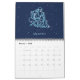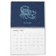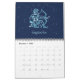 Calendar in the twelve signs of the Zodiac, in light blue, with the constellation for each sign, on a dark blue starry sky background