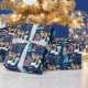 This unique and pretty Christmas wrapping paper has a repeating pattern showing the First Christmas Nativity. Images include the three wise men, a camel, an angel blowing a trumpet, a gold star, a donkey, sheep, Mary and Joseph, and of course, Baby Jesus in the manger. The text in light gold says "Silent Night Holy Night...all is calm". The images and text are placed on a dark night sky blue background. Beautiful, with the Christmas message! *This design uses clip art copyrighted by Encore Software, Inc., which permits use to its licensors. All rights reserved.