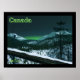 Features a night scene in the far north. Night has fallen and there is a hint of the Northern Lights beyond the mountains on the horizon. Moonlight reflects off the snow-covered landscape. An owl sits in a dead spruce tree seeking voles. Text reading "Canada" also appears in glowing green.