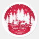 Christmas round sticker featuring white pines silhouettes with snowflakes and a horse-drawn sleigh on a festive red background, with the wording Silent night in handwritten lettering. Easily customisable by adding your own family name or text