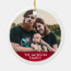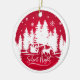 Christmas ceramic ornament featuring white pines silhouettes with snowflakes and a horse-drawn sleigh on a festive red background, with the wording Silent night in handwritten lettering. The back is easily customisable by adding your own family name and photograph
