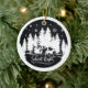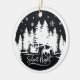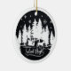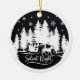 Christmas ceramic ornament featuring white pines silhouettes with snowflakes and a horse-drawn sleigh on a black background, with the wording Silent night in handwritten lettering. The back is easily customizable by adding your own family name and photograph