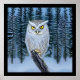 This design features a beautiful majestic little owl perched on a snow covered branch. With the soft muted background of cool blues and greys of the evergreens, the viewer gets an overall effect of peacefulness and serenity which evokes the quiet beauty of a winter forest night.