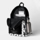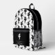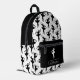 This backpack features a pattern of a black silhouette ballerina on a white background for the main body. The pocket, however, is black with one single white dancer, and your name in white on a black banner beneath the image. The top of the bag is also solid black, making a nice modern contrast.