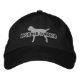 This fantastic Border Terrier hat is embroidered with the dog breed's silhouette, standing with its name printed in front. The Border Terrier silhouette is a dark silver grey, and the text outline is white. Looks fantastic on our black hats!